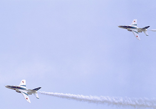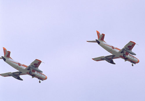 静浜の主役、T-3Jr.の華麗なるデモ飛行。後ろは航空100年記念塗装のT-3 |