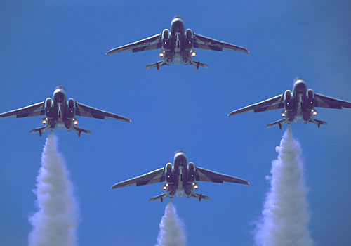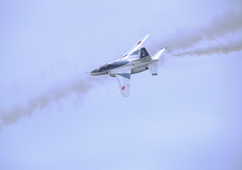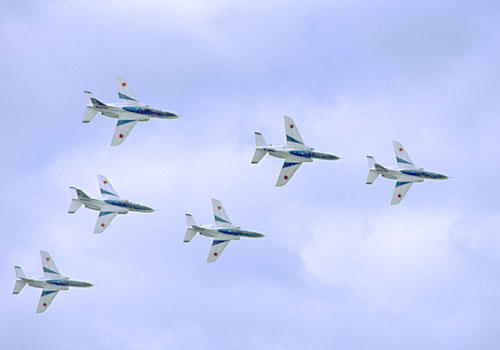 ブルーインパルスの編隊。離陸直後に会場を掠める |