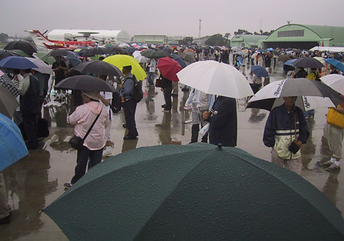 時折雨が降るという悪コンディション。ブルーインパルスを含む外来機のデモは軒並み中止 |