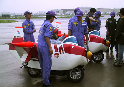 デモ飛行へ向かうT-3。後席の更に後ろに見覚えのある同乗者が |