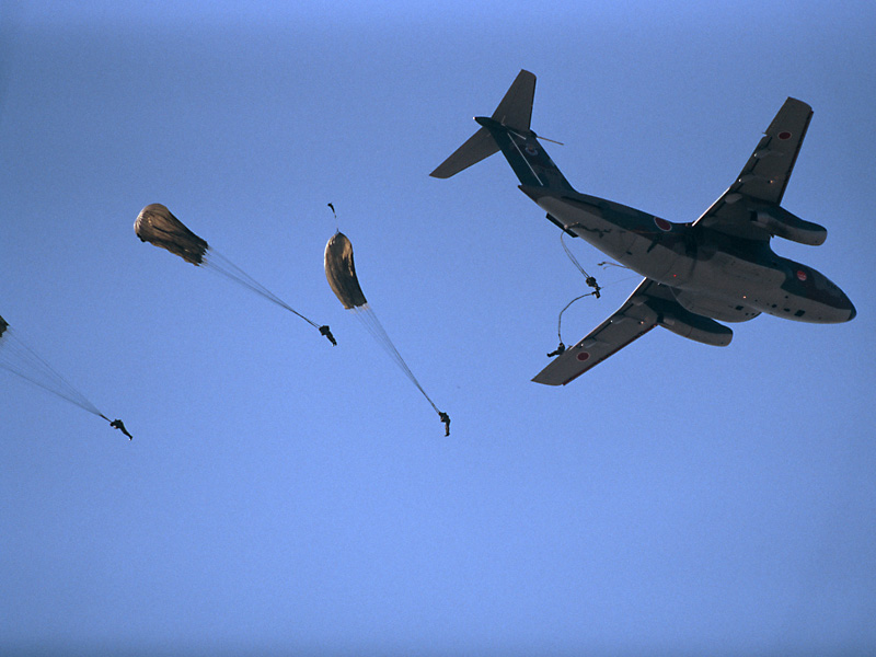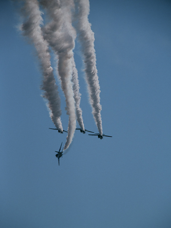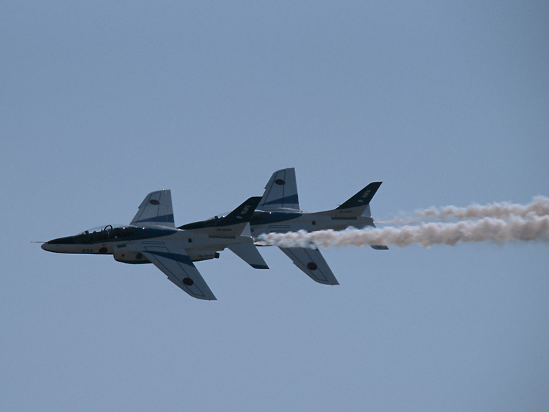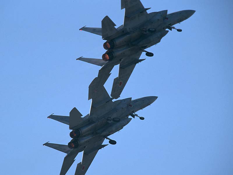 T-2を先頭にF-15が続く編隊のブレイク。実はこの両外側にF-4も居たんですがね |