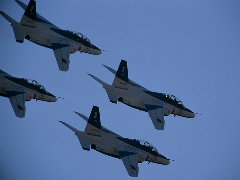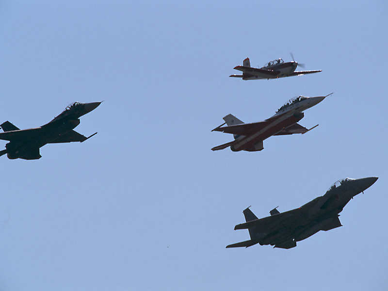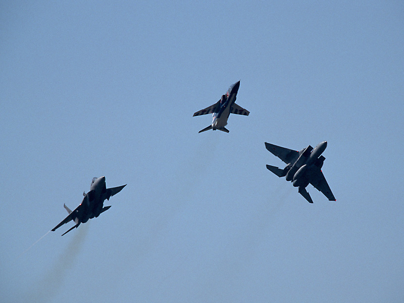T-7を先頭にF-2とF-15が編隊を組む。後続は速度を合わせる為の機首上げ姿勢 |
