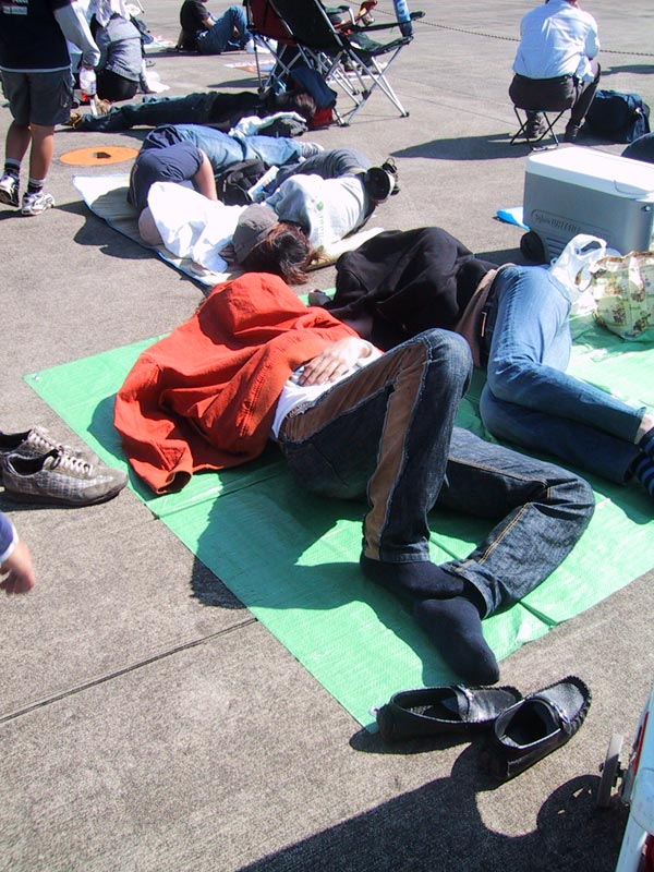 ブルーインパルスのショー開始前は暫くデモフライトが途切れる。なので昼寝をする人々 |