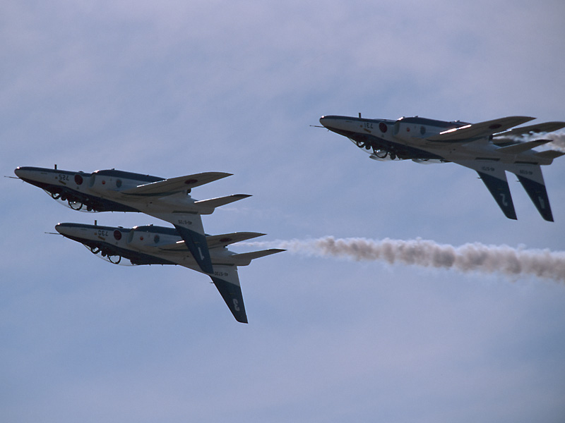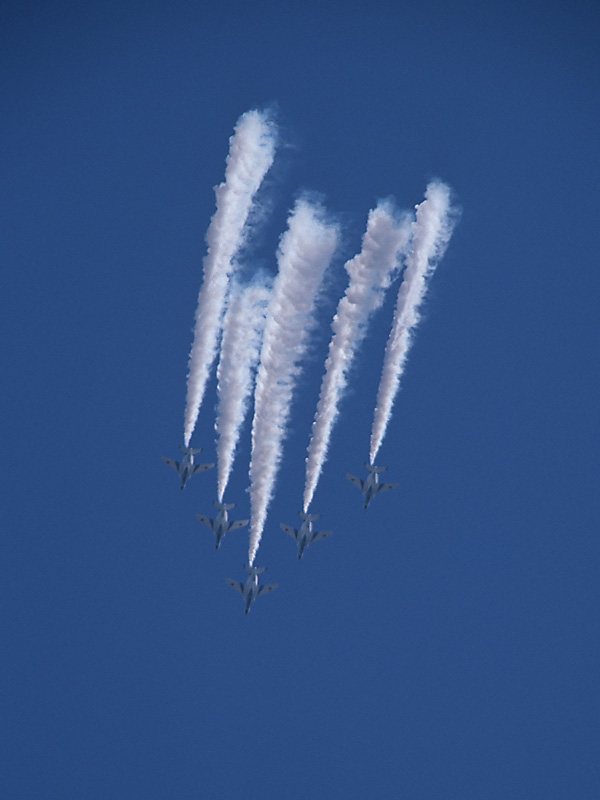 ブルーインパルスのデモ。#5が離陸直後に上昇反転し戻って来る、ハーフキューバンエイト |