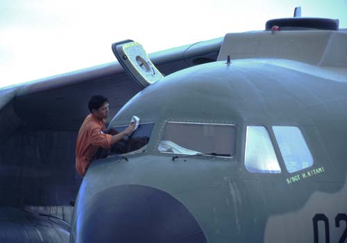 C-1の窓を拭く人 側面前方側の窓は開けられるのです |
