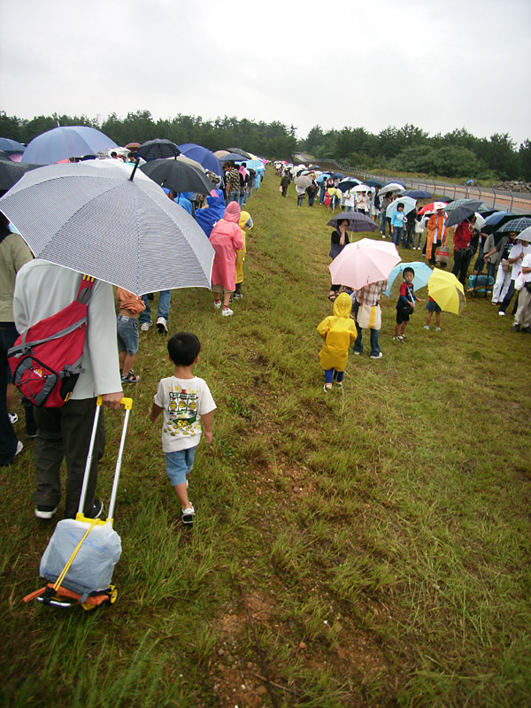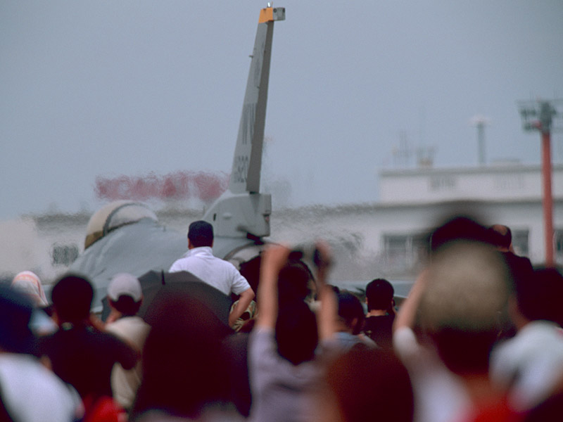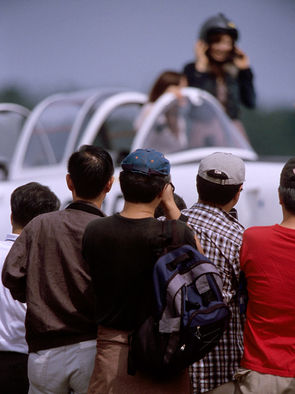 T-7の上でおねえちゃんがポーズを取る場面を撮る人々 |