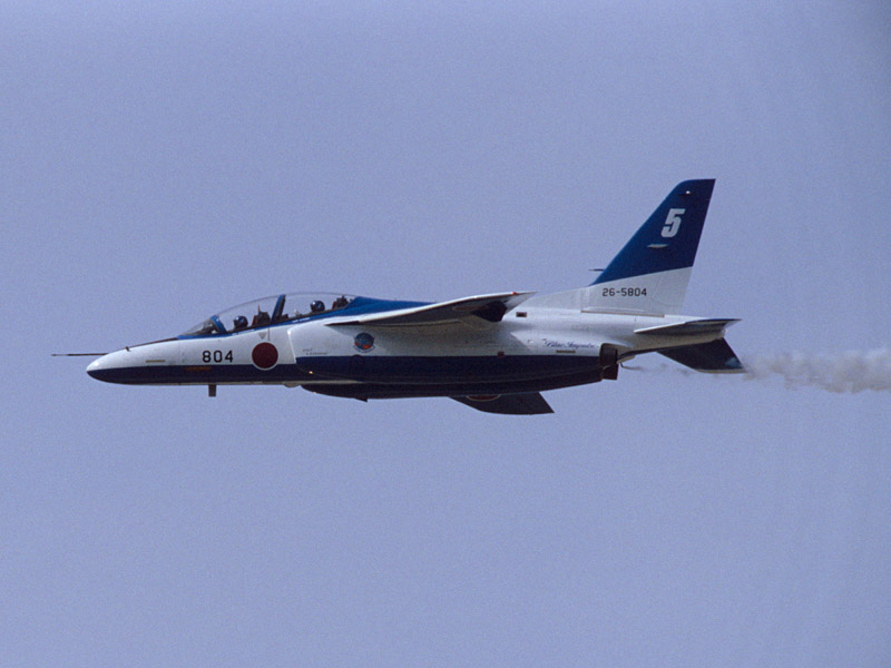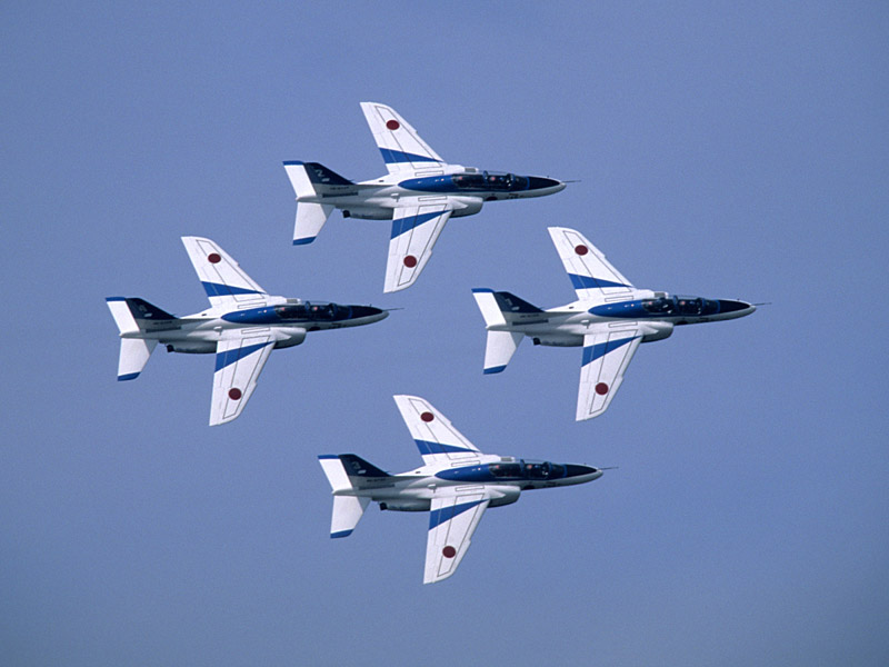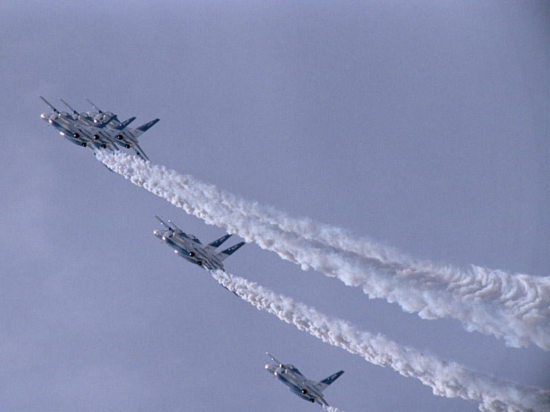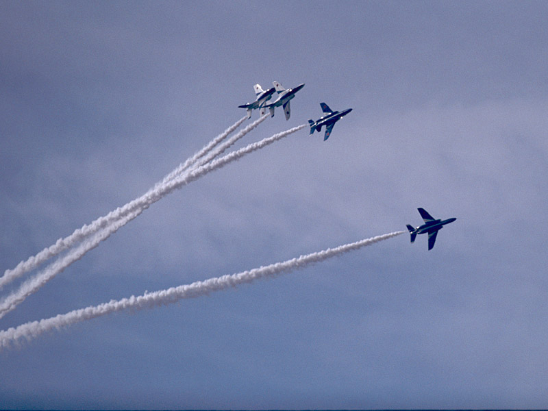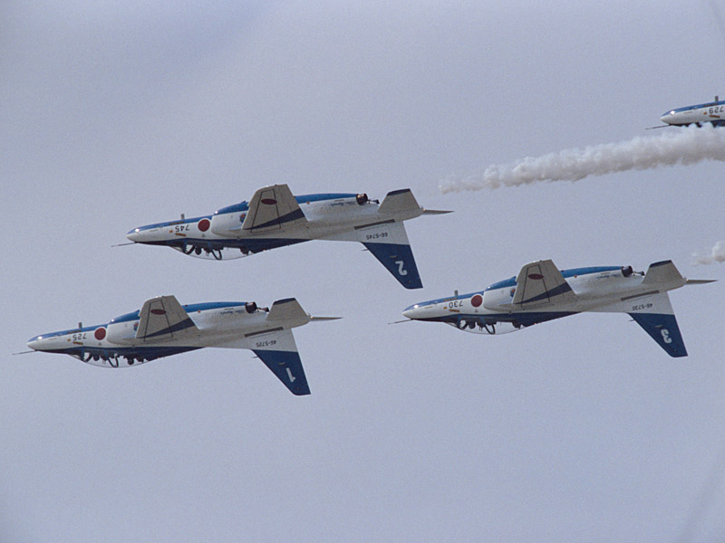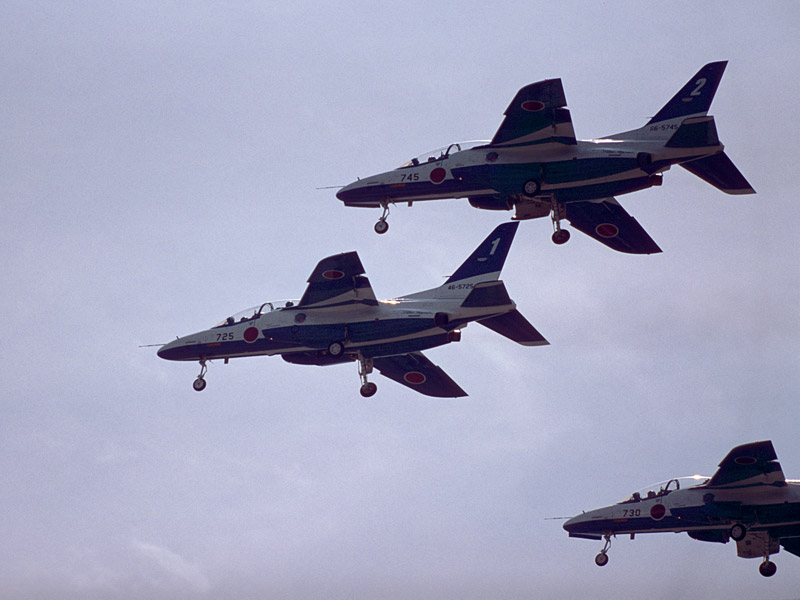ブルーインパルスの編隊が離陸後に見せる脚下げのローパス |