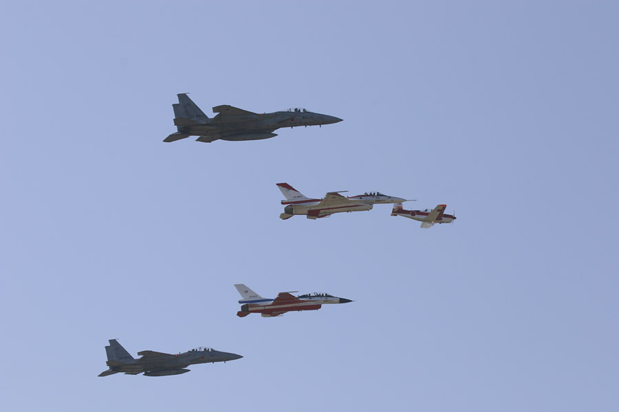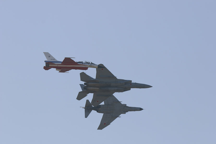 T-3がF-2とF-15を従えた編隊。速度を合わせるのが高難易度だそうな |