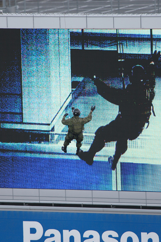 巨大ディスプレイに映る自らの姿を確認する隊員様 |