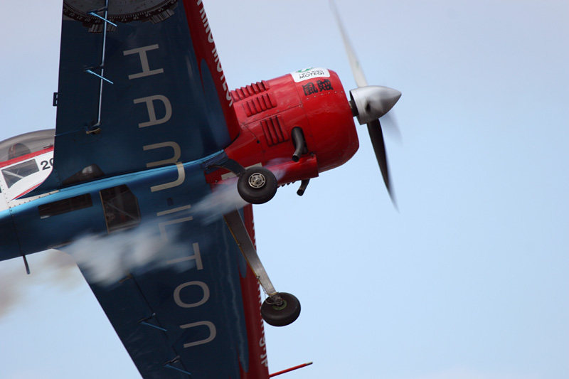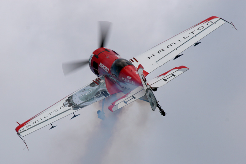 ナイフエッジで腹を見せて通過するExtra300S |
