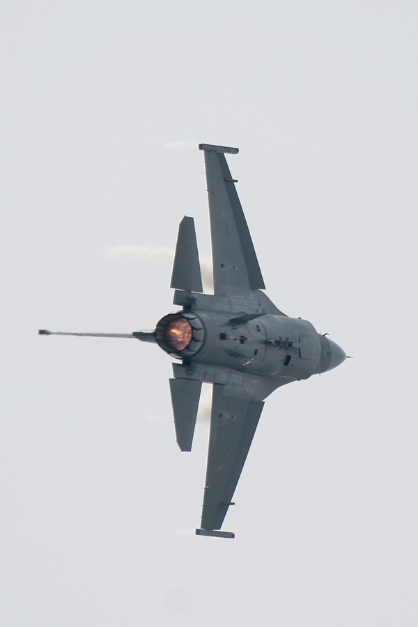 青森の三沢基地から飛んできた米空軍F-16デモチームのフライト。…前脚扉の建付が悪いのか、元々そういう作りなのか |