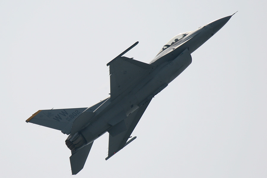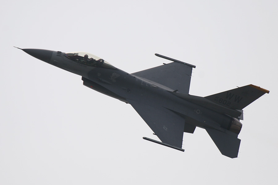 背中を見せるF-16CJ。しかしこの機体は視界が良すぎて飛行士が不安になったりしないのか |