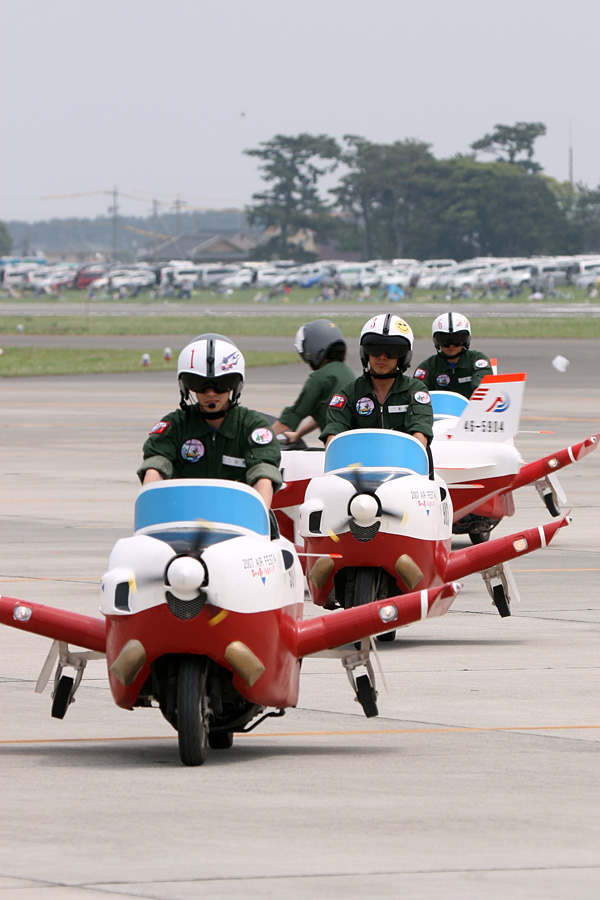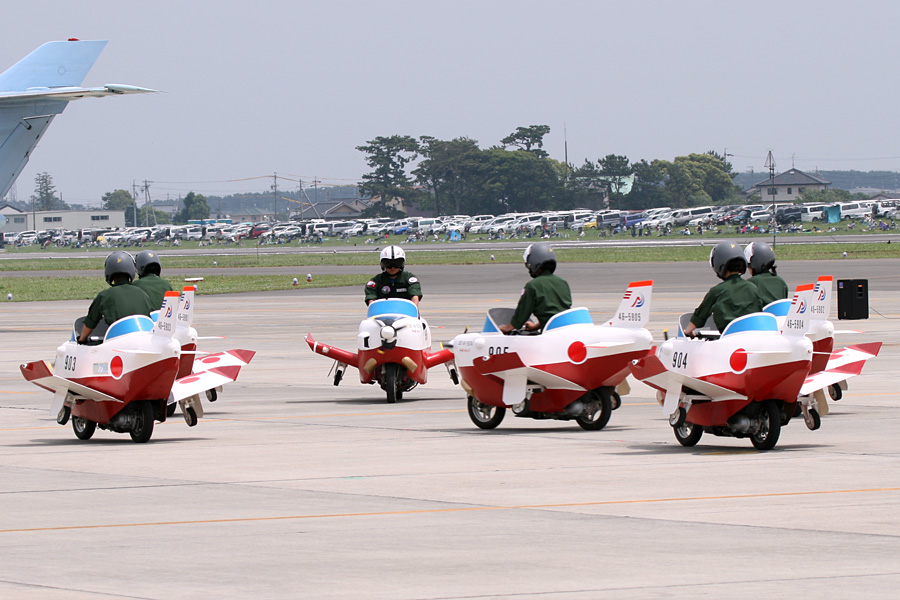演技終了後のウォークダウン。4番機の機付長が預かるヘルメットの内側には詰め物。苦労してるのね |