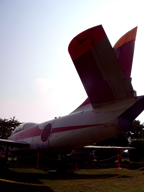 隠居してゲートガードというか基地内のグラウンドに展示されているT-1。美しい機体ですなあ |