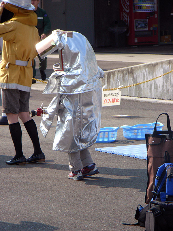 消防装備の展示で耐熱服を試着していた少年 |