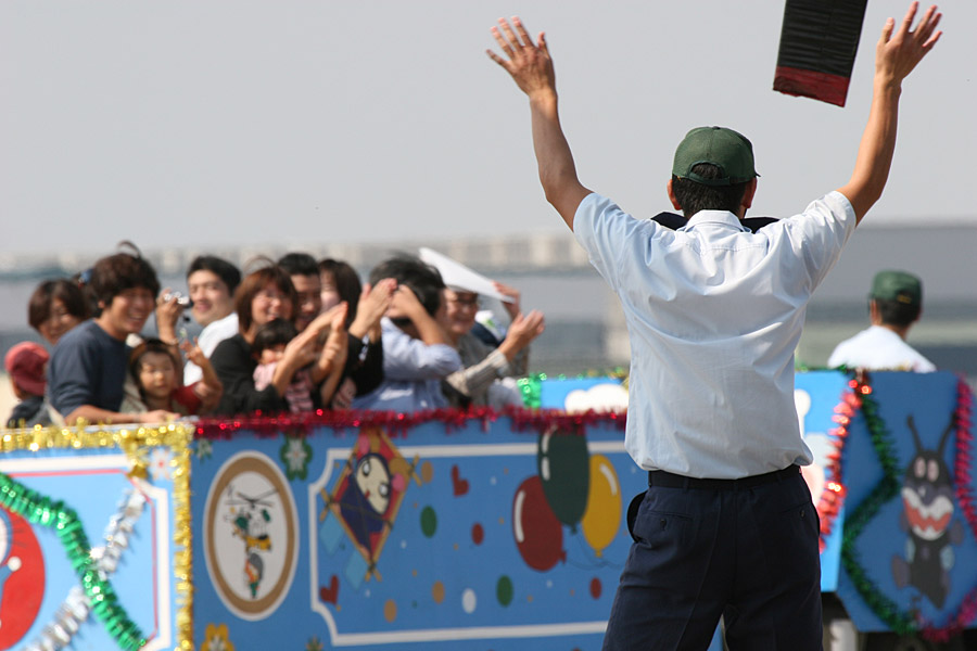 航空祭名物、エプロン区域を巡回する花自動車に目一杯サービスするお兄さん |