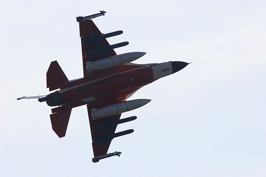 フル装備のF-2が離陸。この後そのまま横転をする元気っぷり |
