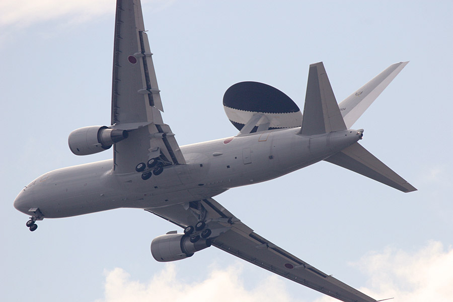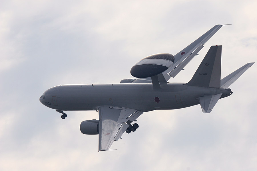 背中にでっかいお皿を乗せたE-767が離陸 |
