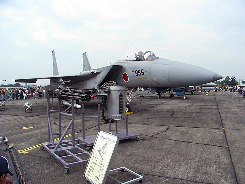 第1術科学校のF-15の前では機関砲が。黄帯と茶帯を巻いた対空弾の実弾も展示されてました。推進剤だの炸薬は抜いてあるんでしょうが |