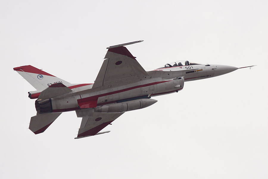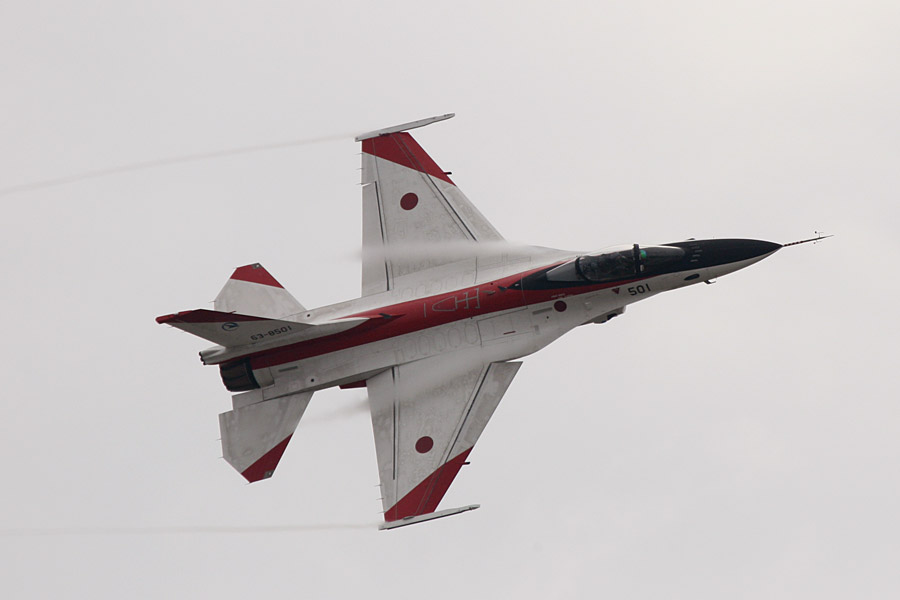 F-2のデモフライト。赤白の機体は岐阜基地にある飛行開発実験団のテスト機 |