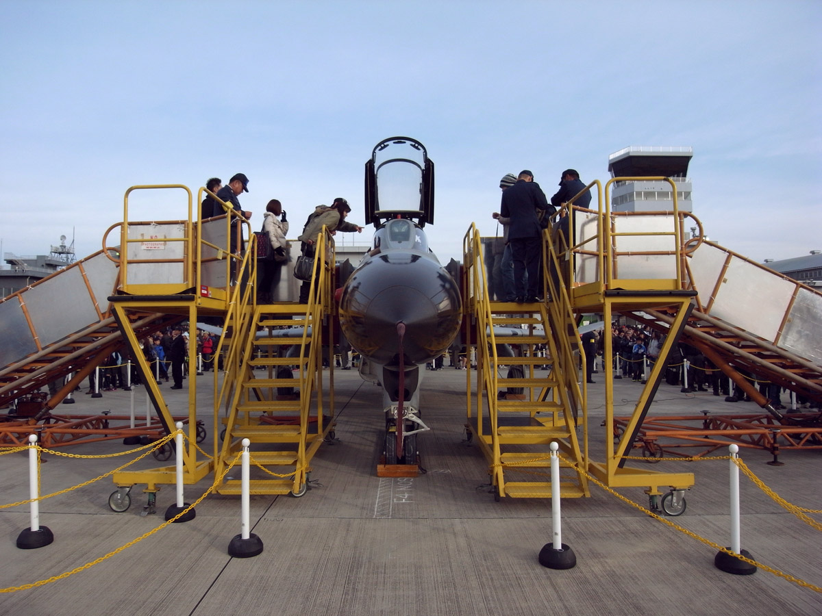 地上展示機のF-4EJ。操縦席公開で左右にタラップを寄せられて窮屈そう |