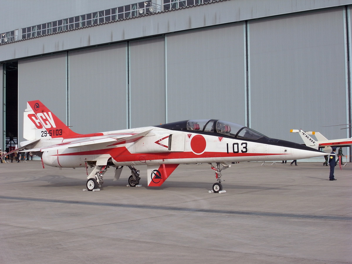 岐阜祭名物になっているT-2CCV研究機。赤白稲妻模様は技術研究本部(TRDI)の標準塗装 |