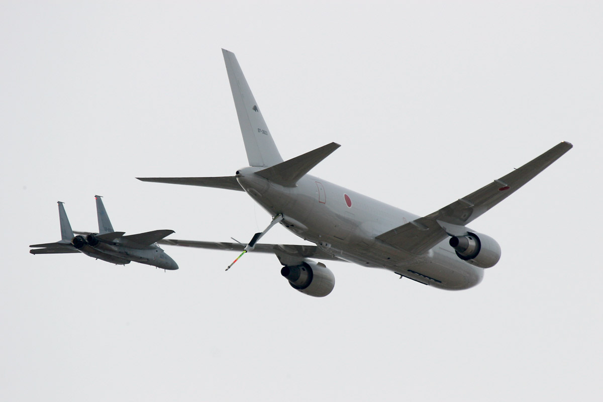 小牧にある第1輸送航空のKC-767とF-15Jが空中給油のデモ。とは言え本番なしの寸止めです |