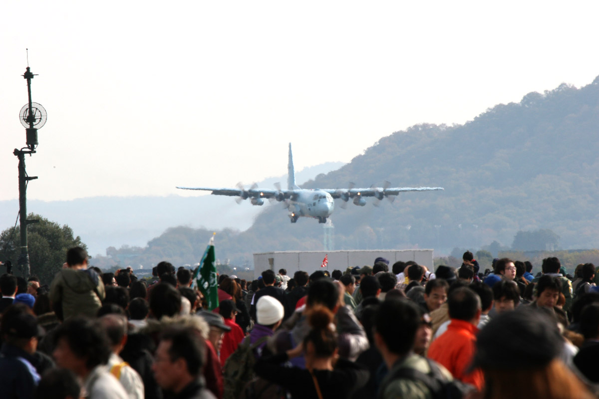 人垣の向こうで短距離着陸性能の高さを披露するC-1 FTB。前列に陣取って降りを撮るとかそんな元気ないです |