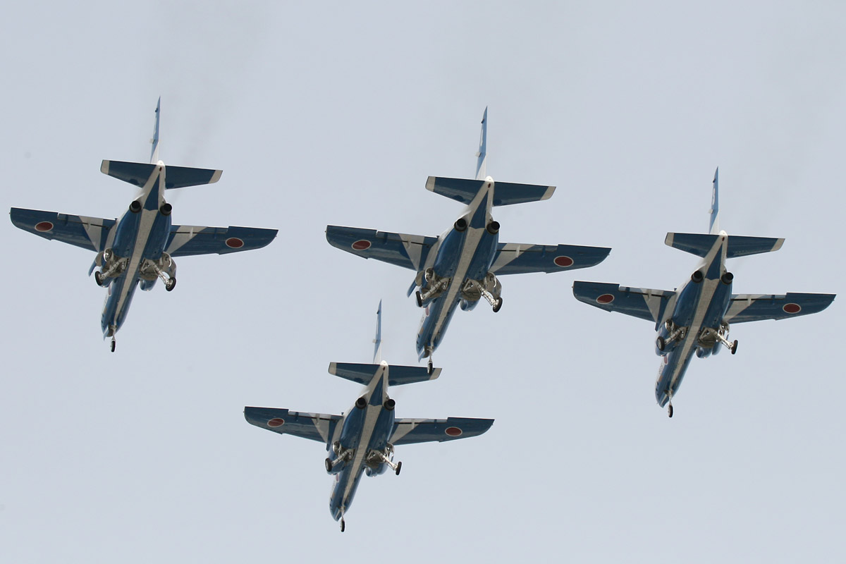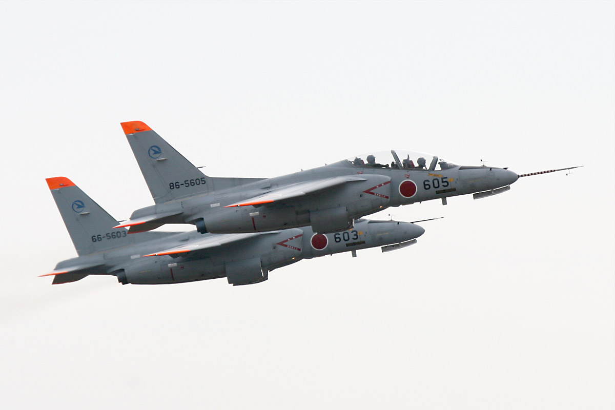 飛実団の午後のデモに離陸するT-4。長いピトー管付きの#605はテストパイロット養成用の機体 |