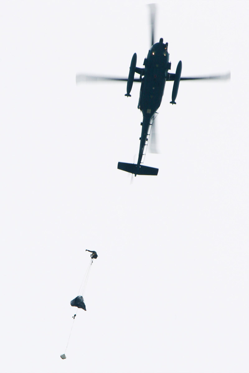 救難隊のデモ。UH-60Jから何か飛び出す |