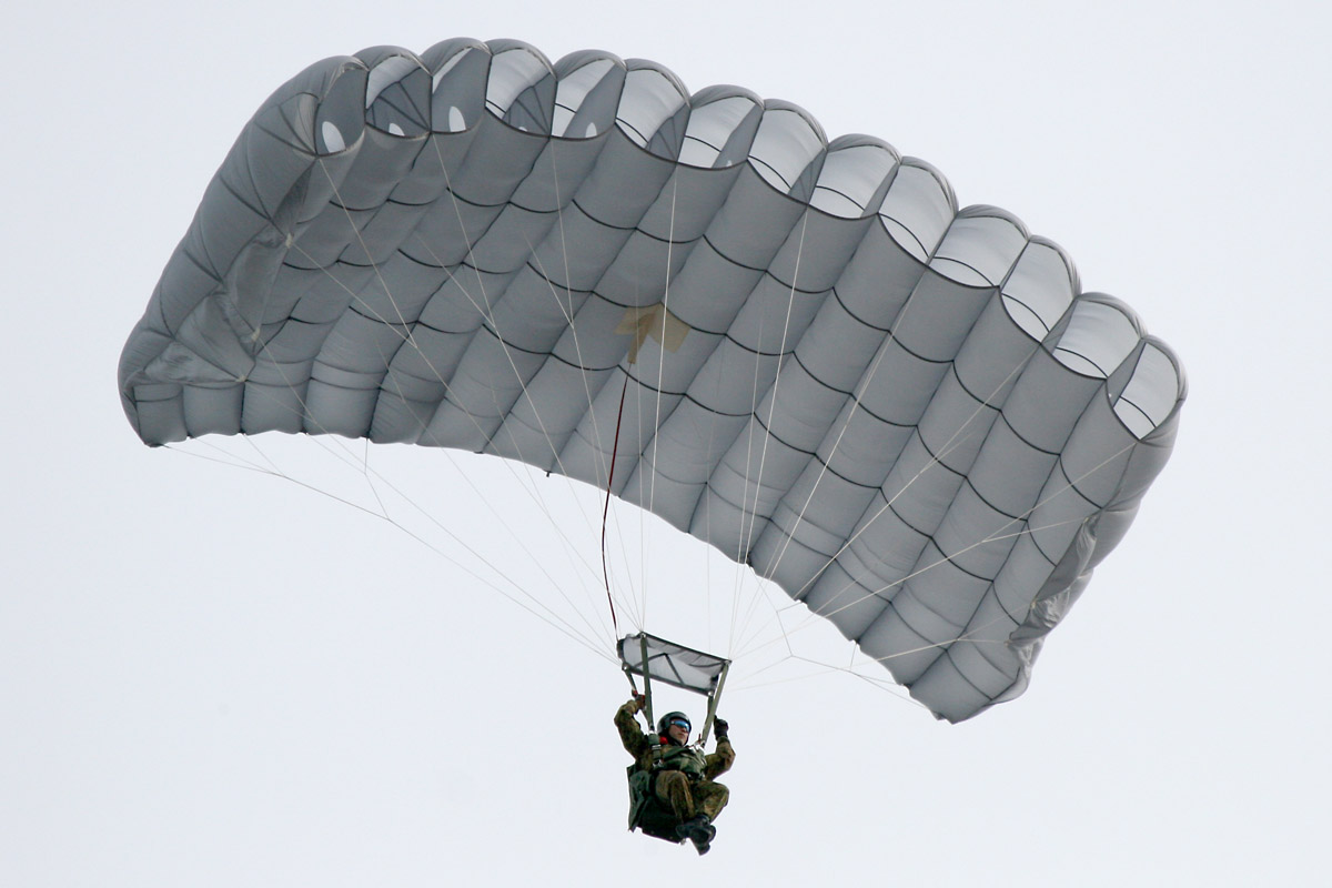 救難隊員のパラシュート降下でした。四角いパラシュートは降下の操縦性が優れてるそうな |