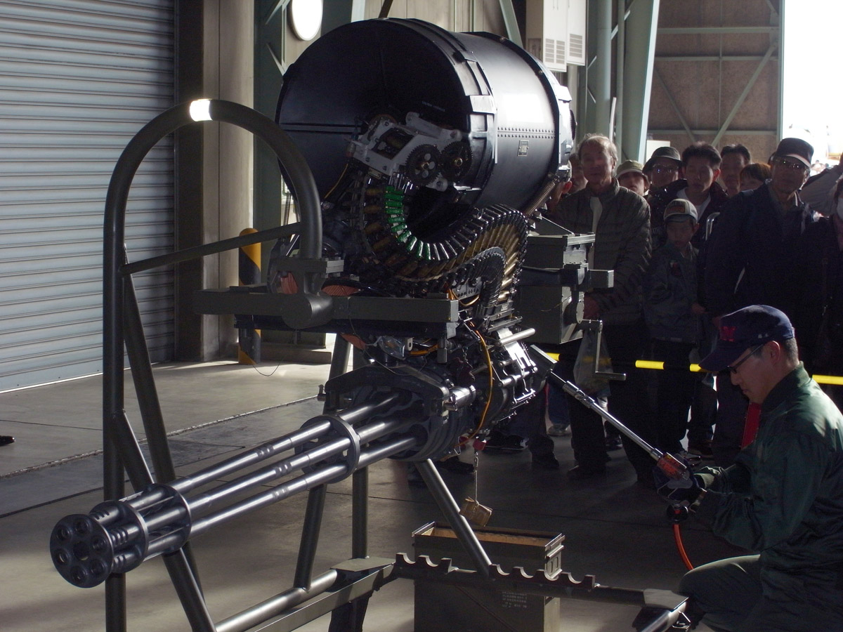 F-4EJ用のM61A1バルカン砲。本来油圧で駆動する機関部をエア工具で回すデモ中 |