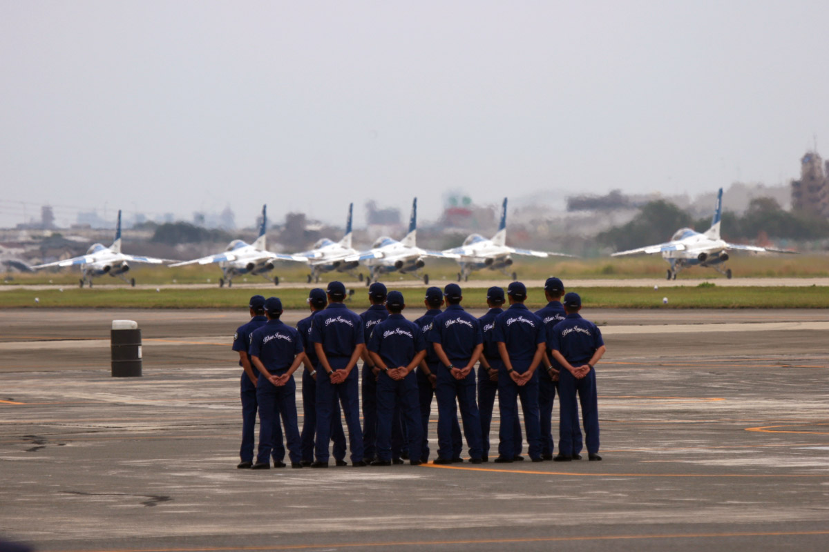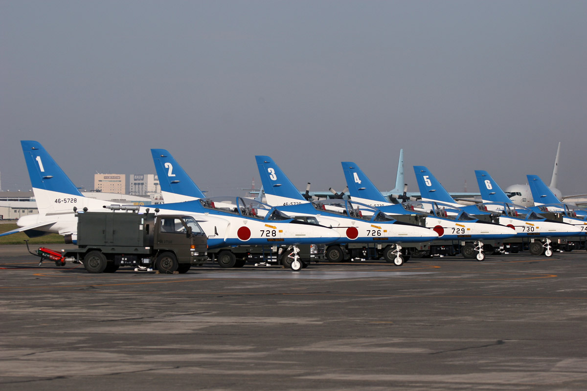 航空祭には参加せず『同日開催の中部空港での演技のため待機』という名目で並んでいるブルーインパルスのT-4 |