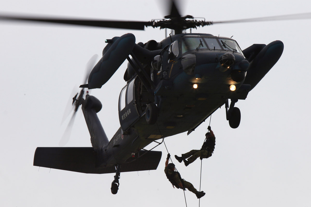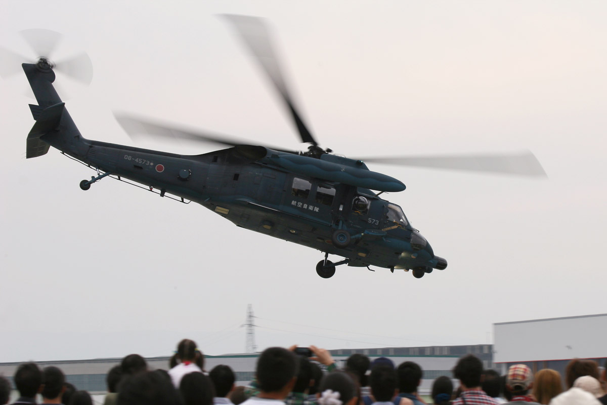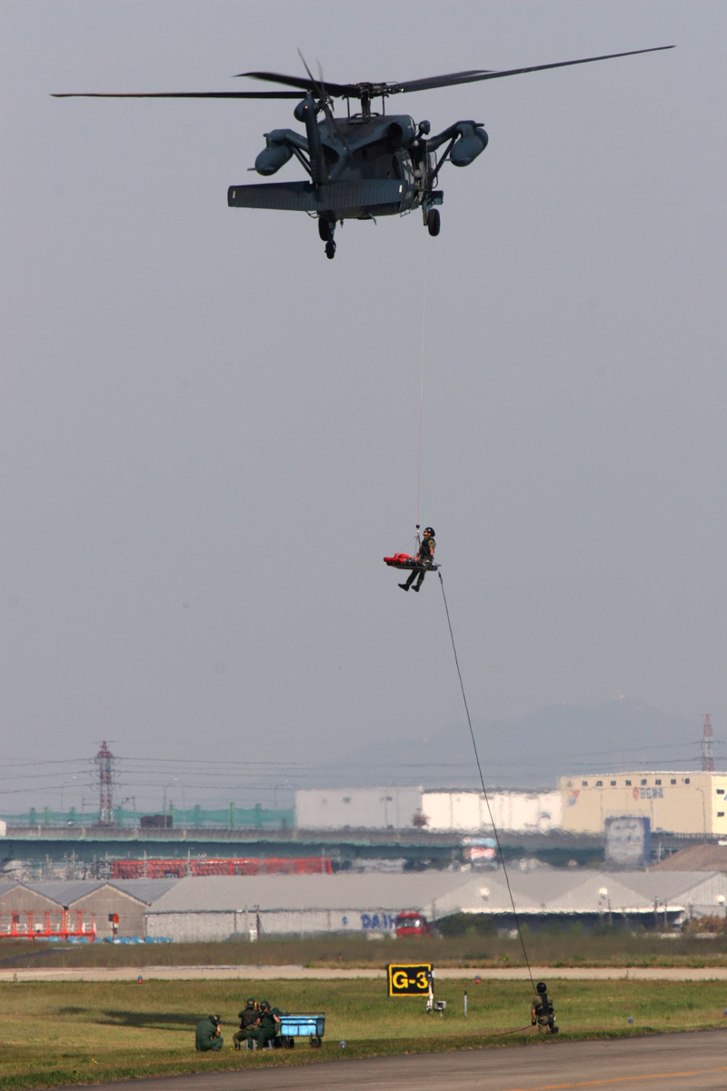 UH-60Jがストレッチャーを吊り上げているところ。 小牧は人垣が少ないのでこういうデモが良く見えるのがいいところ |