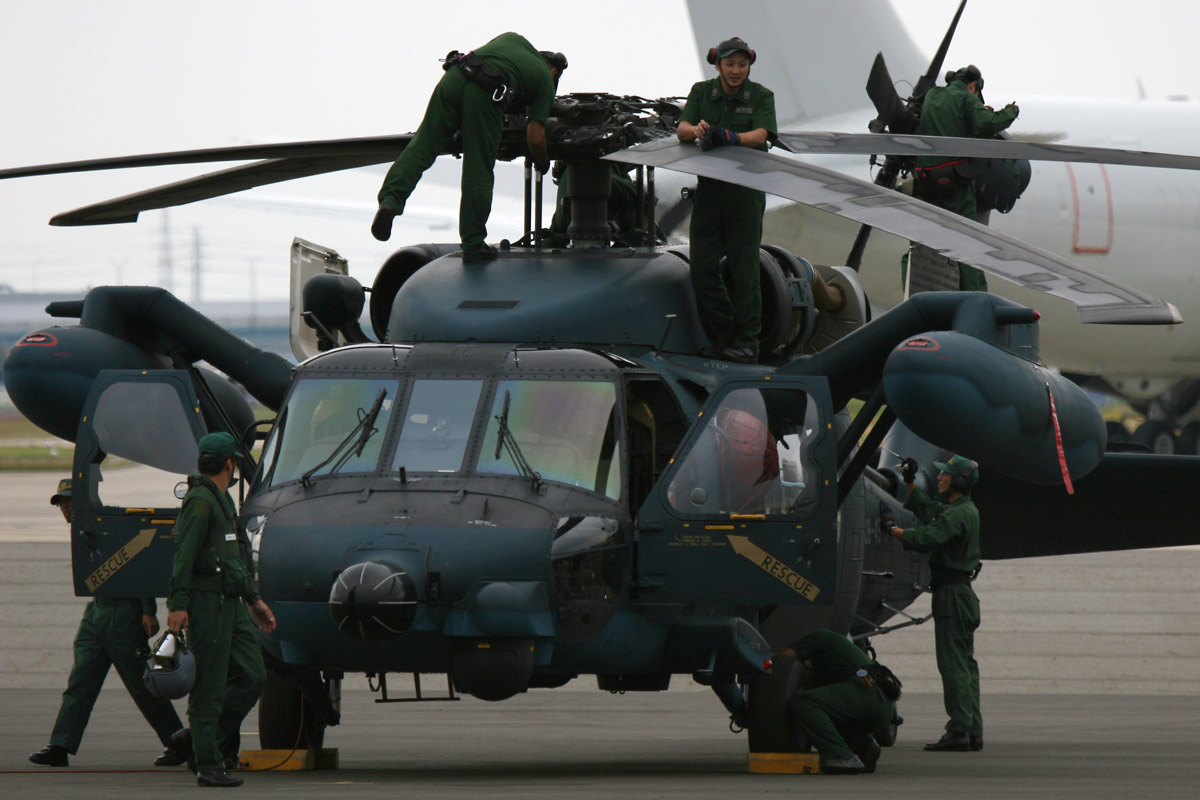 UHが降りると沢山の人が寄って来て着陸後の点検が始まります |
