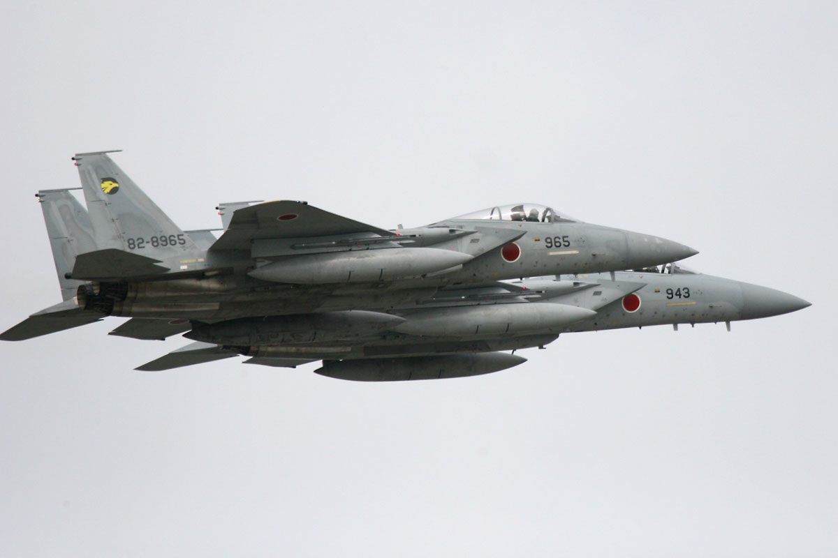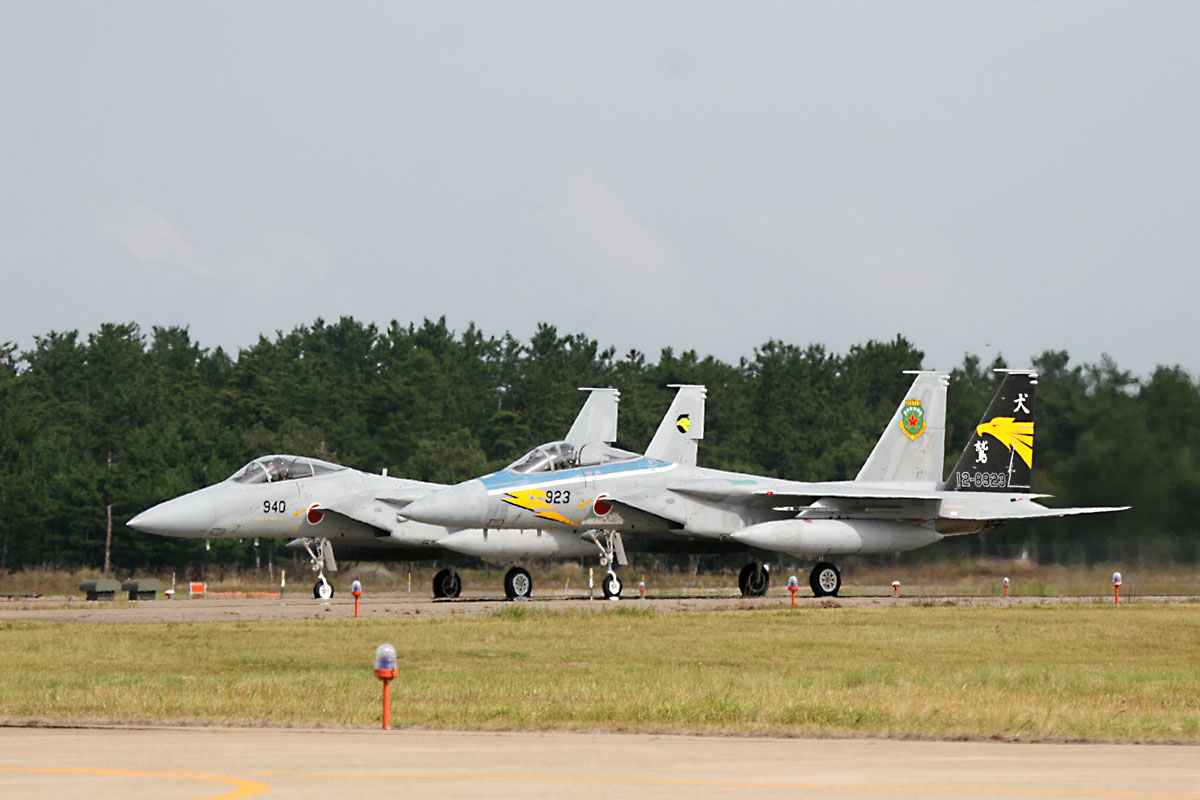 第306飛行隊のF-15Jがデモを終えて戻ってくるところ。#923は犬鷲の記念塗装機 |