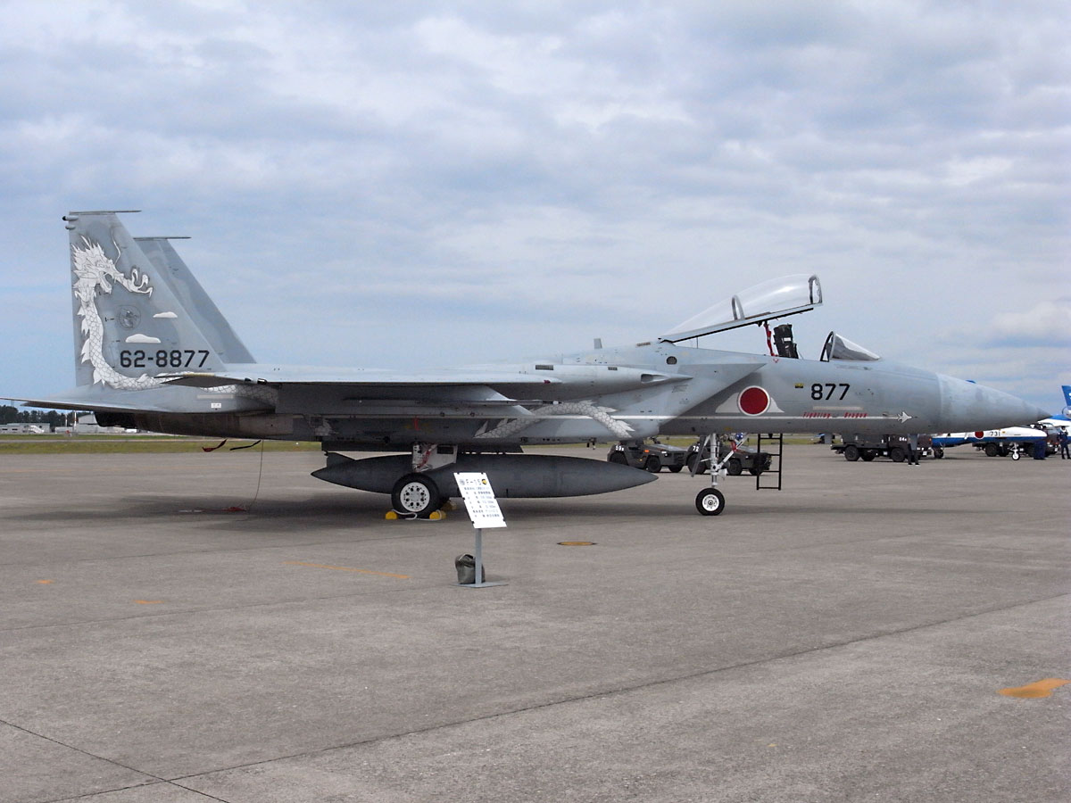 航空祭では定番、ジャッキアップされた「あんよは上手」デモ用のF-15 |