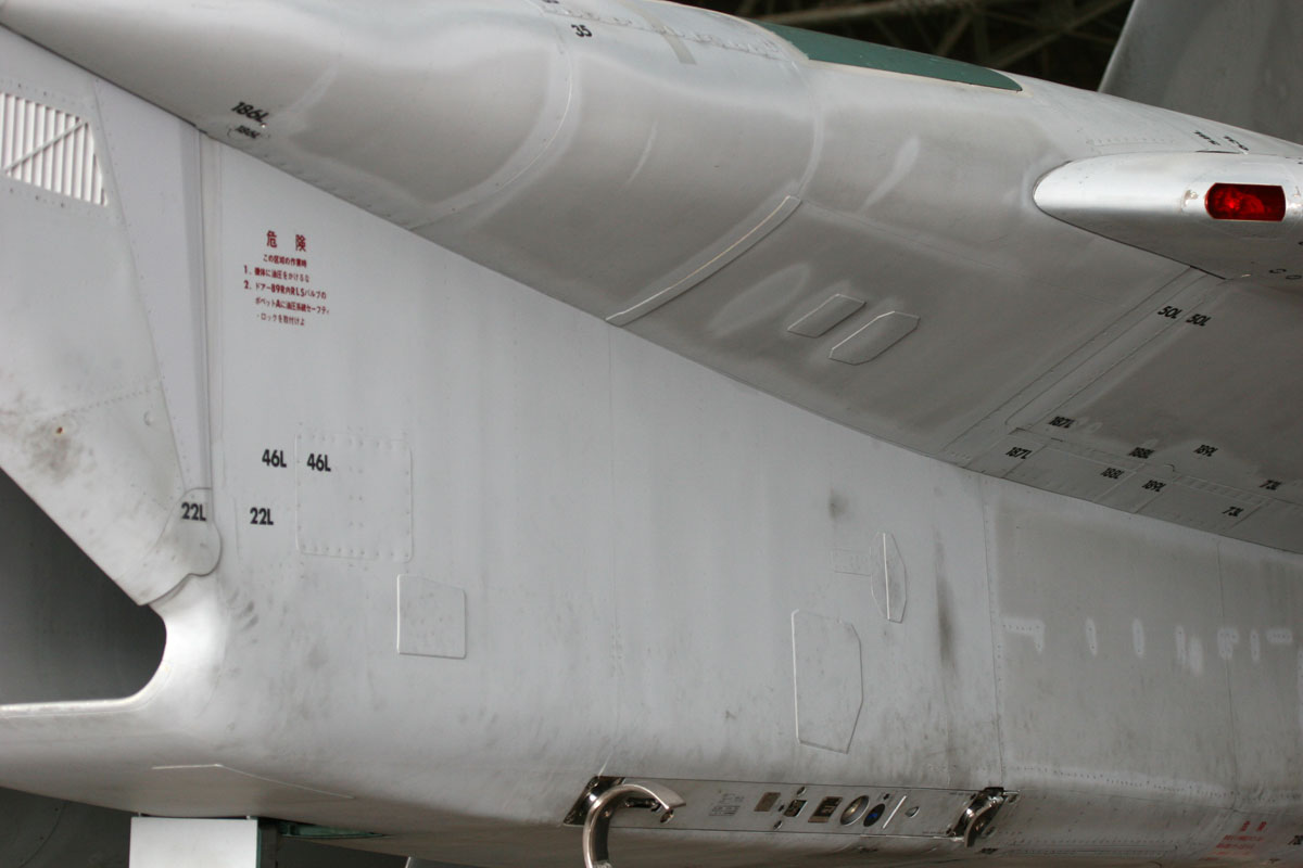 その機体のインテークダクト辺り。 あっちこっちに補強パッチが当てられている |