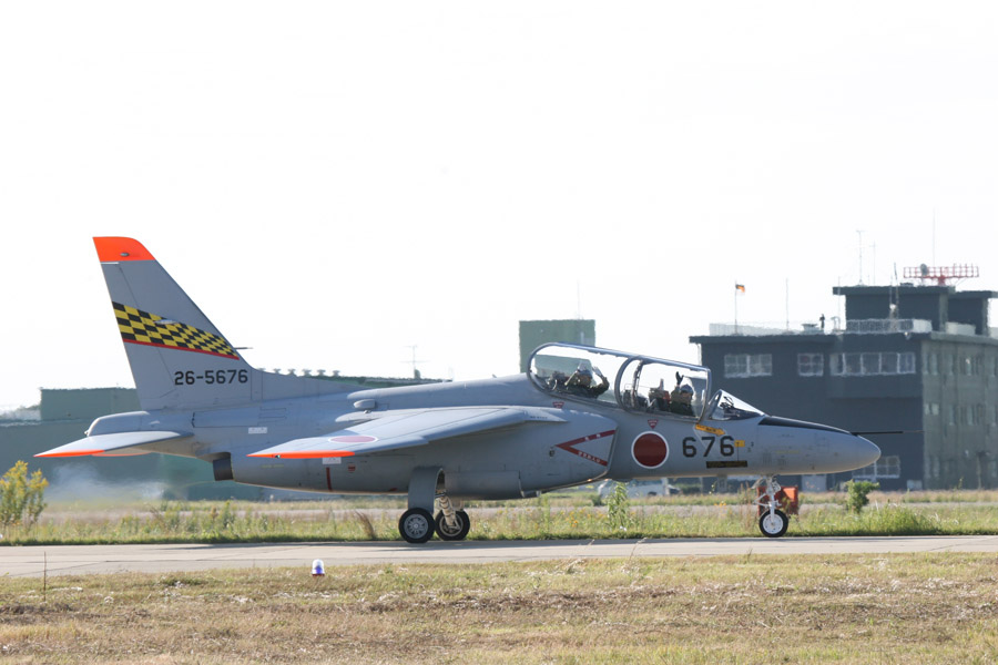 オープニングフライトから降りてきて第32飛行隊のT-4。 キャノピー越しにサービス任務を遂行する乗員 |