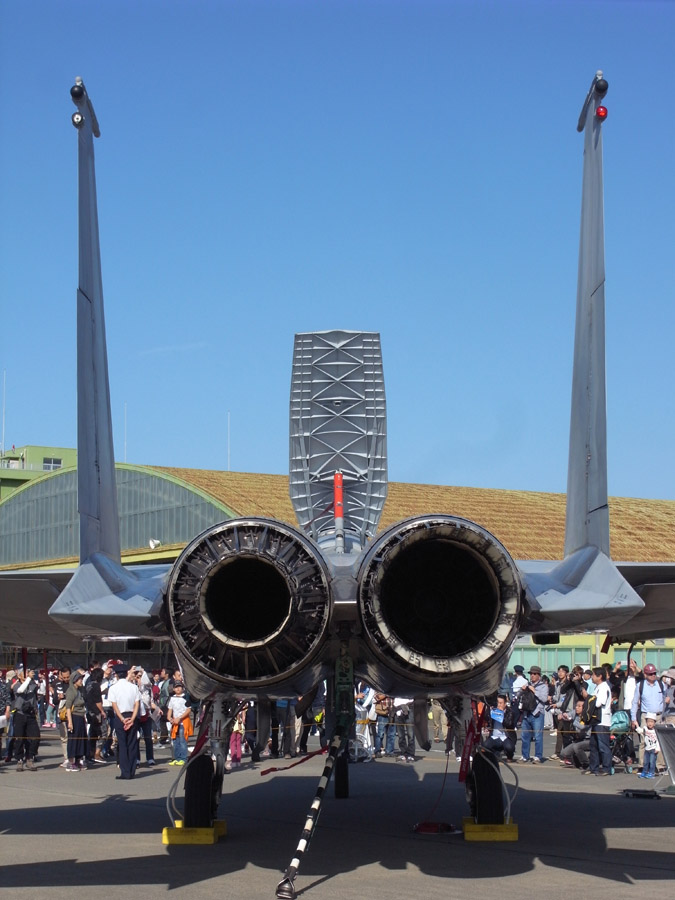 これも第1術科学校のF-15J。 F-15のスピードブレーキ裏側は通常外板が張ってあってつるんとしてるのだがこの機は構造材が見えている |