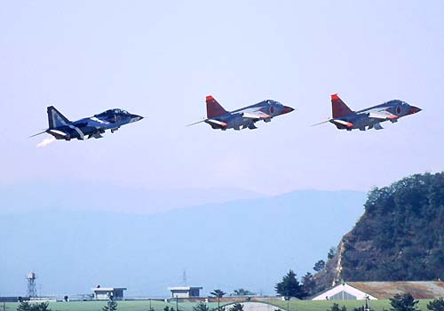 T-2練習機が三機で編隊離陸。1機は元ブルーの機体 |