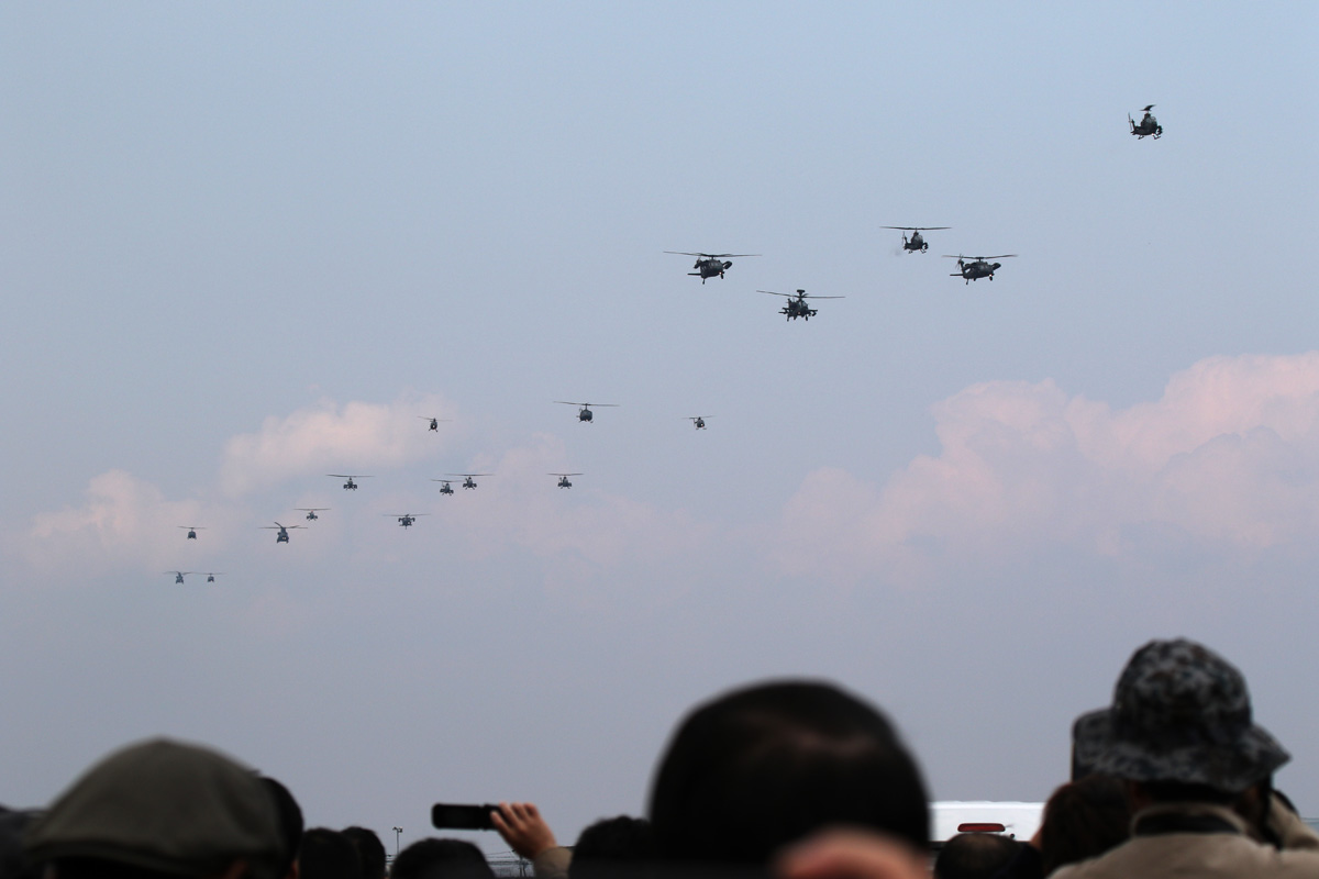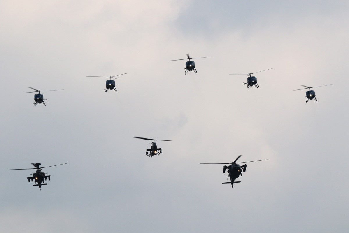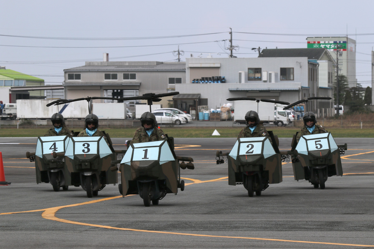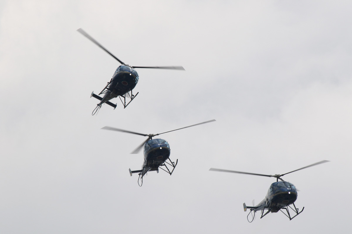練習機として使われているTH-480Bの編隊組み替え。青メタに金のラインはメーカー標準塗装なんだって |