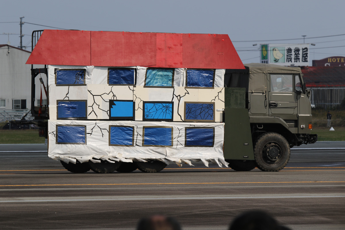 災害支援デモ用に被災建物っぽい何かを背負った73式大型トラック |