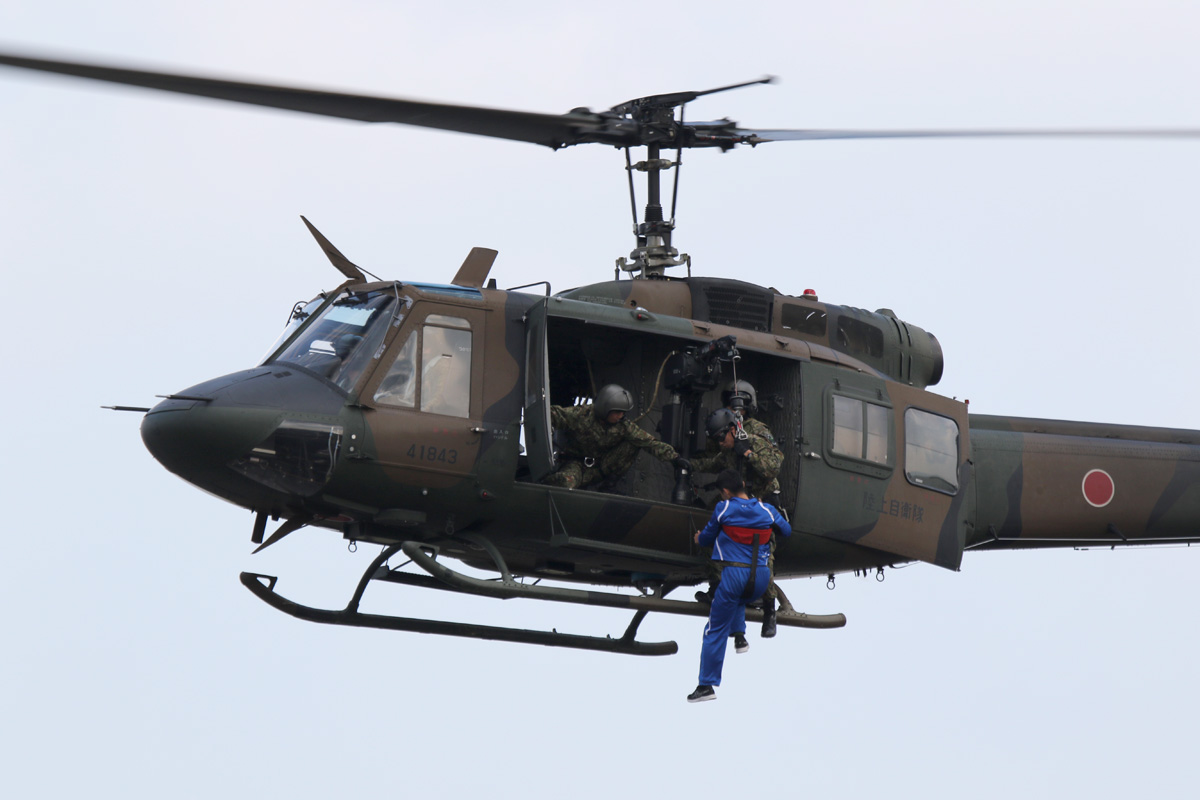 ホイストで吊られてUH-1に収容される要救助者役の人は物凄くきびきびした動作であった |