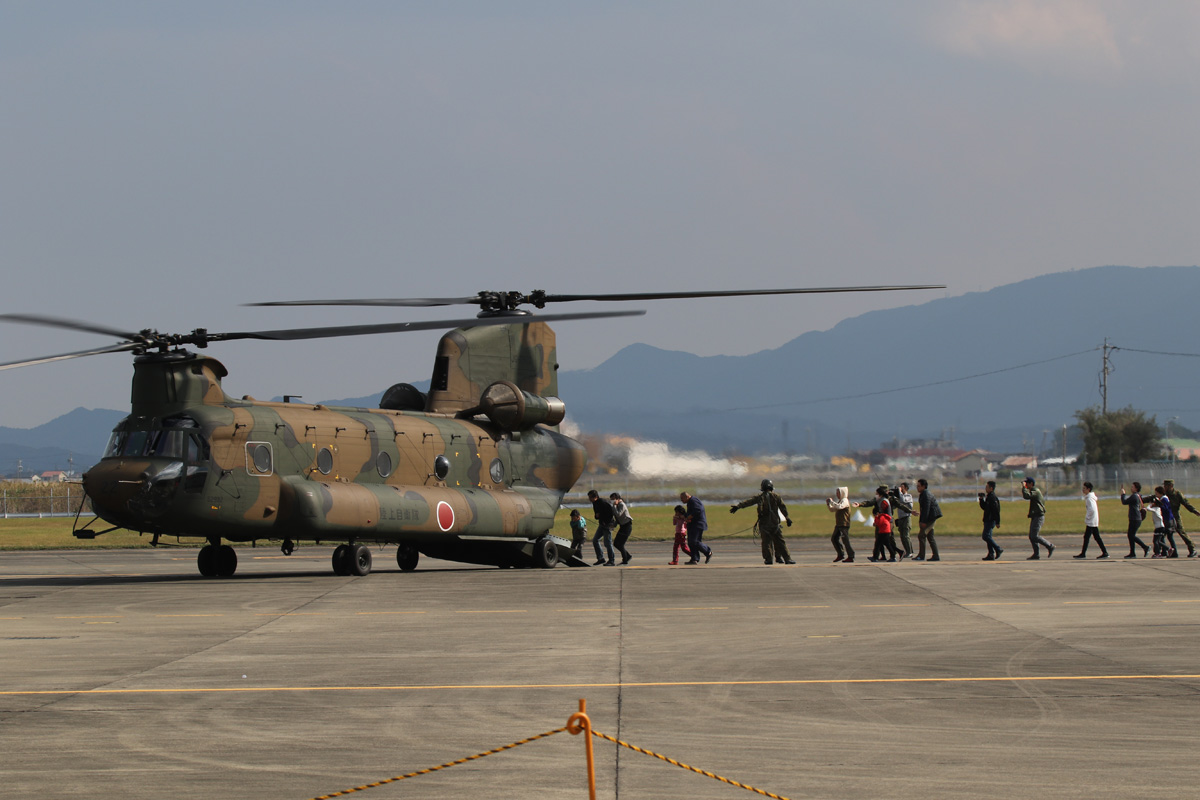 午後はCH-47が体験搭乗で活躍 私服の人達がぞろぞろ乗り込む様子はまるで怪獣映画で避難する住民のよう |