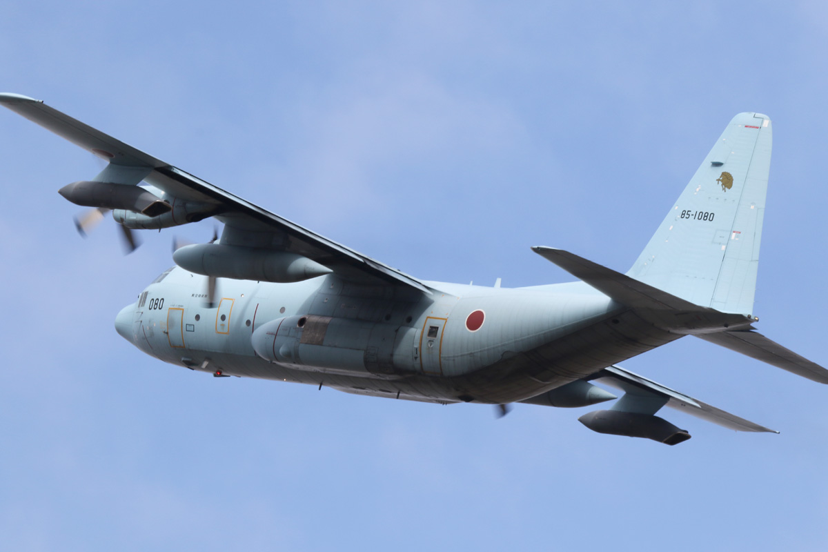 小牧基地から応援のC-130H。尾翼のマークだが今は蚤じゃなくて天馬。以前は金鯱だった |