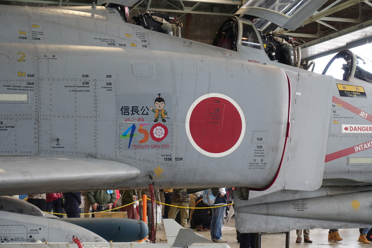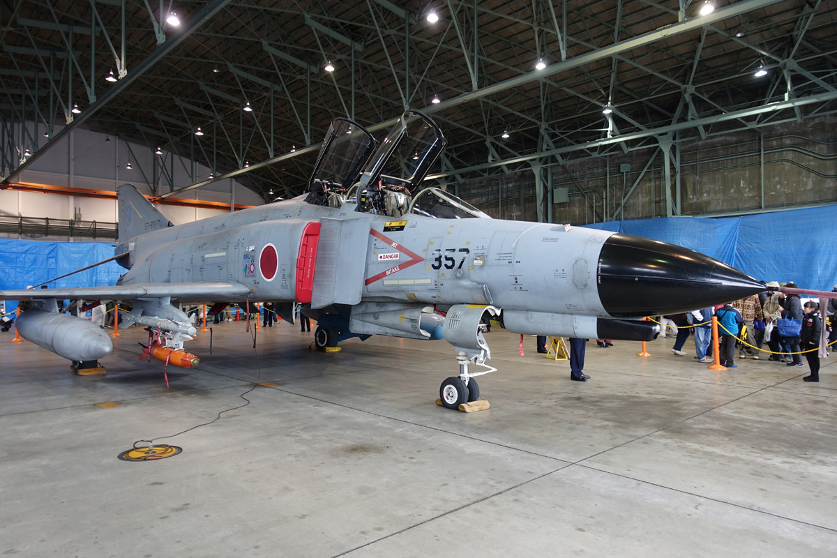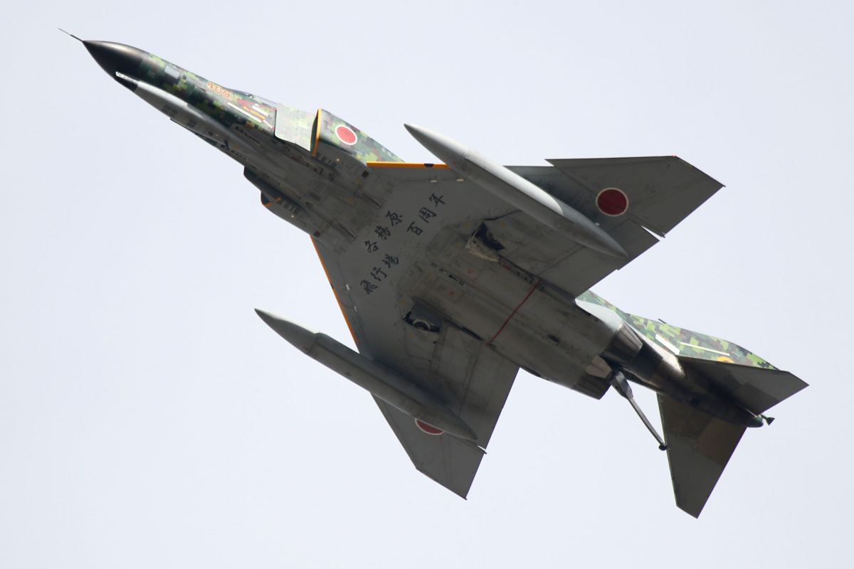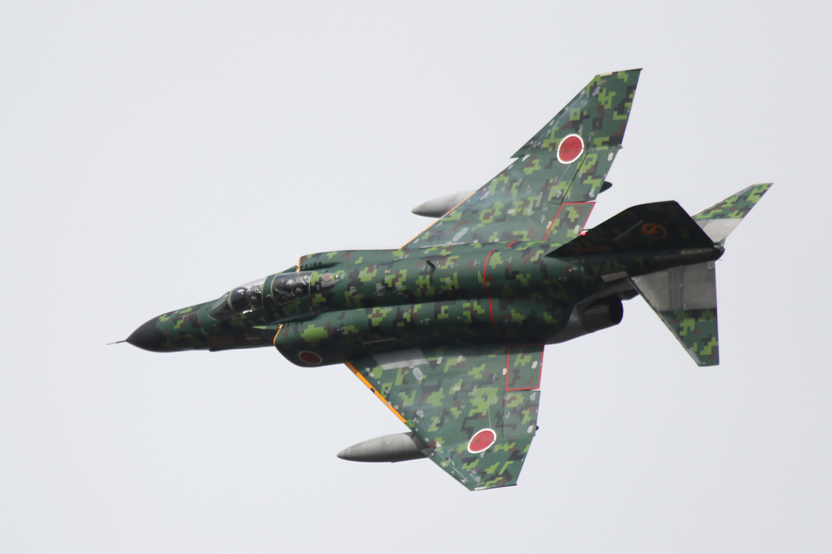 凝った緑のデジタル迷彩な特別塗装のF-4EJ改。内翼前縁が黄色いのは旧軍機風 |