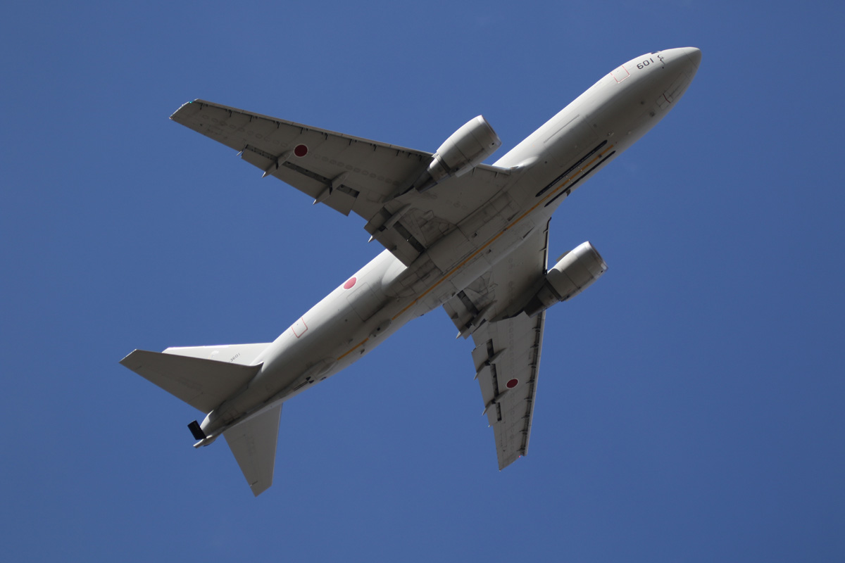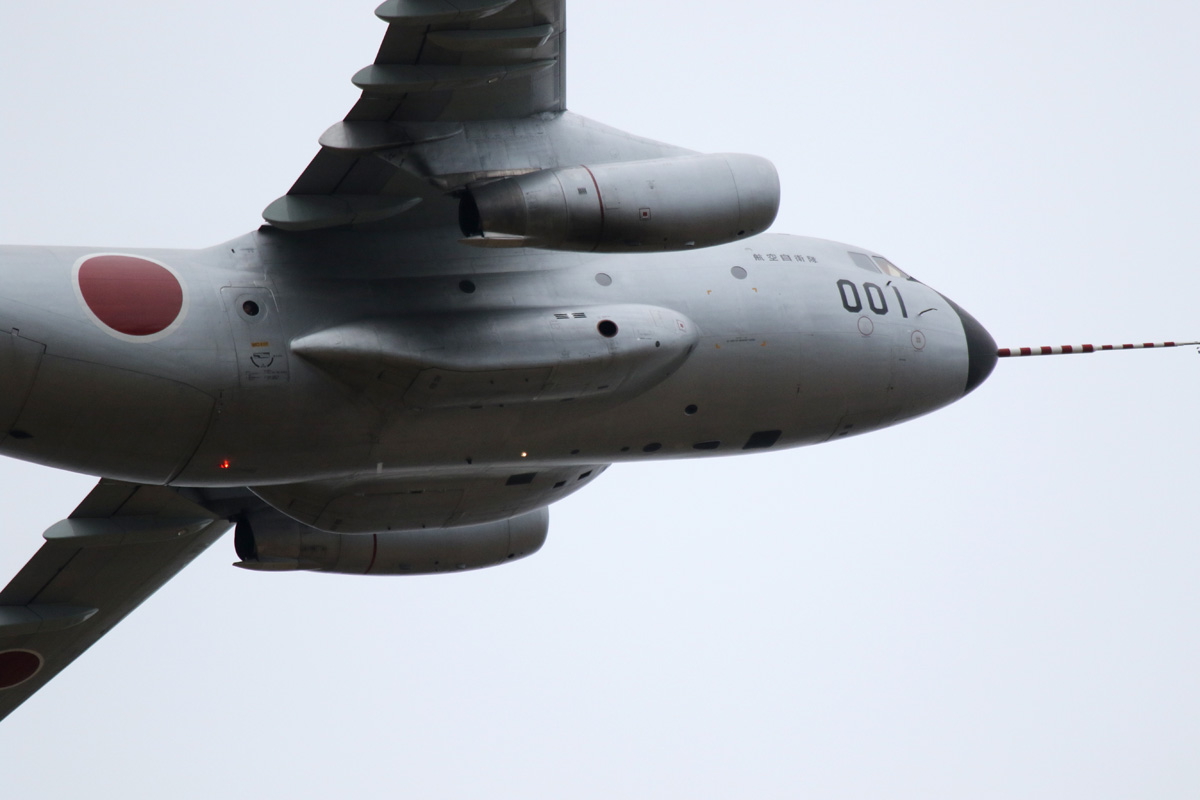 雨雲の下でも映える銀塗装のC-1FTB。FTBとはフライトテストベッドの略 |