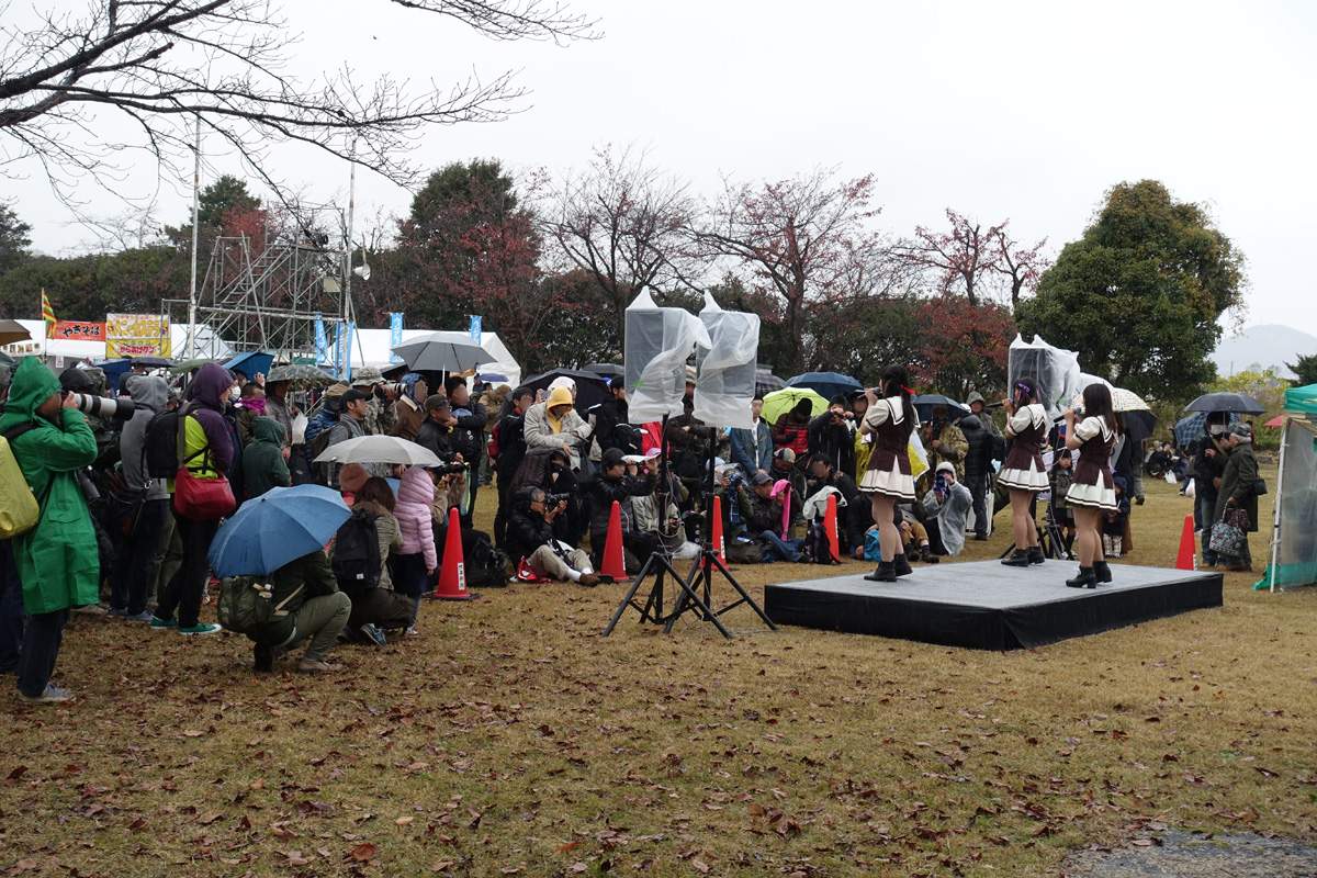 基地南側のイベント会場では降りしきる雨の中やや自棄気味に営業をこなすアイドルさんの姿 |