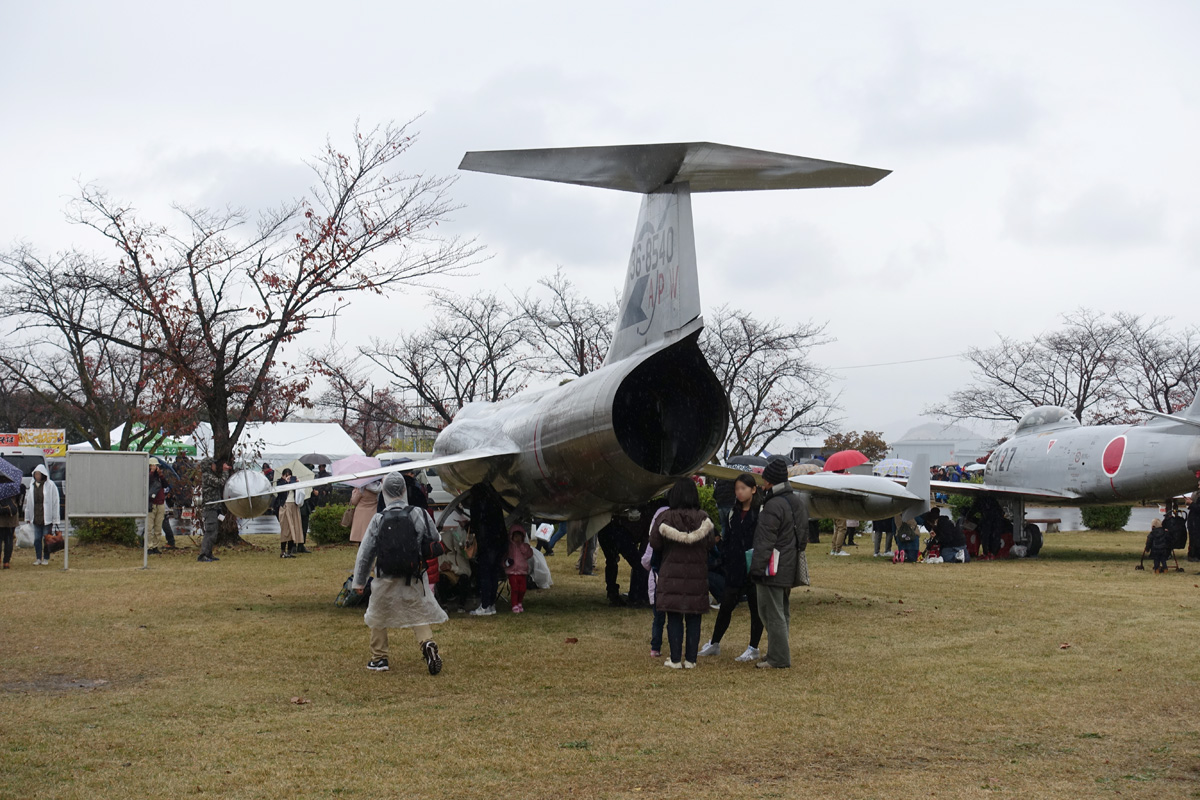 荒天の航空祭では良くある翼下雨宿り大会。F-104は翼が小さいので不人気 |
